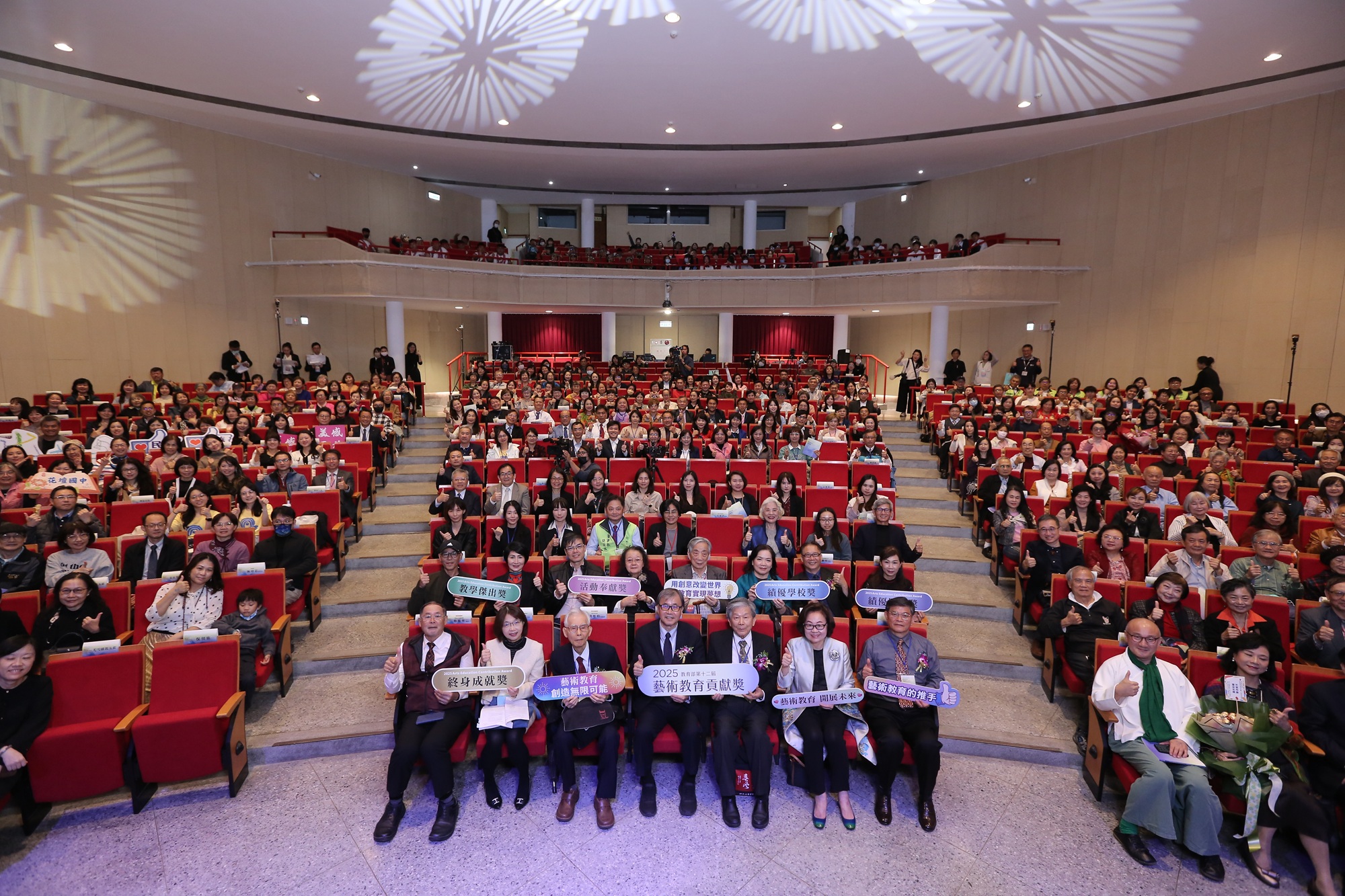 本屆「終身成就獎」頒予林智信先生、洪惟助教授、蔡麗華教授及羅振賢教授共4位藝術教育界前輩。